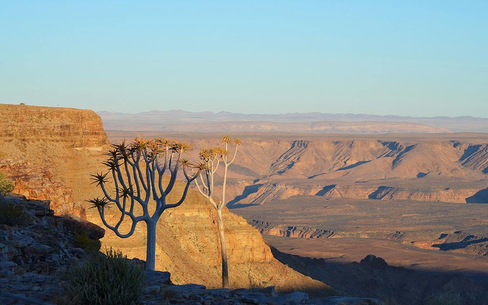Dag 7-8 Next stop: Fish River Canyon. Je bent in Namibië! Deze kloof is de íets kleinere versie van de Grand Canyon in Amerika, maar er doet absoluut niet aan onder. Deze op een na grootste kloofvan de wereld is nog wat minder bekend bij het grote publiek. Je geniet er dus in alle rust van het uitzicht. De kloof is in totaal 160 kilometer lang en op sommige plekken zelfs 550 meter diep.