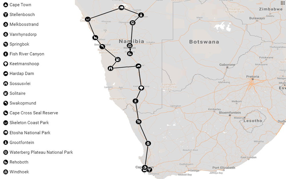 In drie weken tijd maak je deze camperreis langs alle highlights van Namibië en de westkust van Zuid-Afrika. Je start je reis in Kaapstad of Windhoek. Waar je begint maakt niet veel uit. Vanaf Amsterdam vliegen er rechtstreekse vluchten naar Kaapstad, maar niet naar Windhoek. Als je vliegt van of naar Windhoek, maak je een tussenstop in Johannesburg. Of je dit op je heen- of terugreis doet, is aan jou.