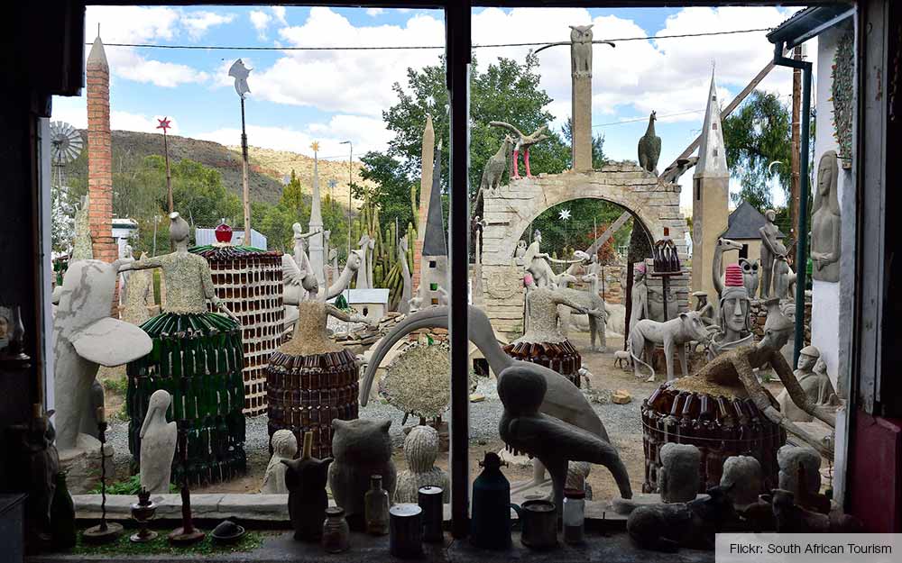 Nieu-Bethesda zelf is een minuscuul plaatsje. Er wonen zo’n 1.500 mensen, waaronder een hoop kunstenaars. De bekendste inwoner was kunstenares Helen Martins. Ze leed waarschijnlijk aan een bipolaire stoornis en pleegde in 1976 zelfmoord, maar niet zonder een fantastisch kunstspektakel na te laten. De binnenkant van haar ‘Owl House’ beschilderde ze met felle kleuren en patronen, de tuin vulde ze met gekke beelden. Een aanrader, of je nou geïnteresseerd bent in kunst of niet!