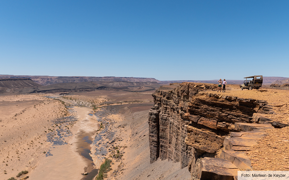 Dan stappen we uit op een klif boven de grotendeels uitgedroogde Fish River. De wind voelt als een warme föhn en suist in onze oren. Verder is het muisstil. Een ervaring die niet te vergelijken is met zijn grote broer in Amerika.