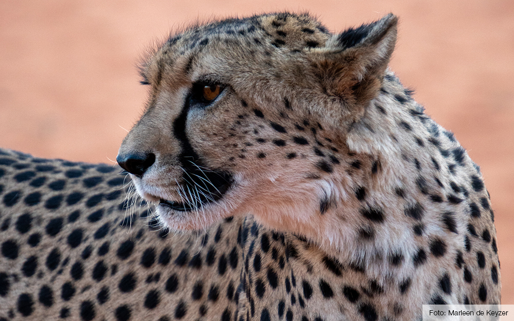 Even later worden we daar meteen getuige van. Als we de duinen in rijden, spotten we twee cheeta’s die net een steenbok hebben gevangen. Verderop blokkeert een gemsbok de weg. Langs de rivierbedding verstoppen uilen zich tussen bloeiende takken. Grazen wildebeesten onder de bomen. Houden stokstaartjes alert de wacht. Maar als we terugkomen bij de lodge, is onze safari pas echt compleet. Bij de nabijgelegen waterpoel staat een leeuw met zwarte manen in alle rust te drinken: de zeldzame woestijnleeuw.