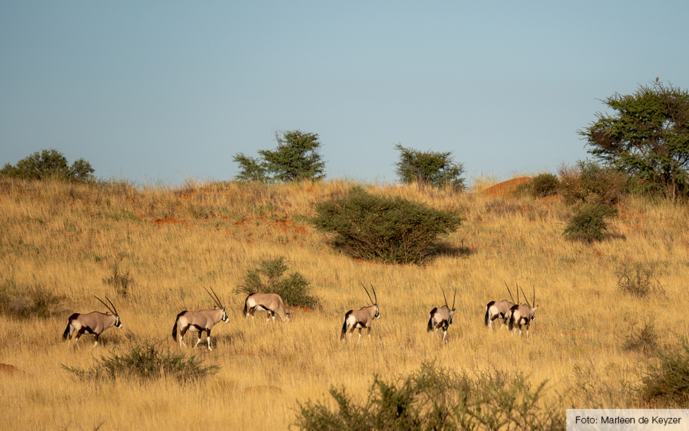‘Zie je hoeveel woestijngras er op de duinen groeit,’ vraagt Castro, een dertigjarige gids die behoort tot de !Kung San. We knikken, het gras kleurt het rode zand groen. ‘Drie jaar geleden zag de omgeving er nog zo uit.’ Castro laat een foto op zijn telefoon zien, genomen vanaf hetzelfde uitzichtpunt. Er is nauwelijks gras, waardoor de omgeving er veel roder uitziet. Castro vertelt dat Covid in 2020 de eerste echte regen bracht in ruim zeven jaar. Veel dieren zijn in de droge periode naar het noorden getrokken of gestorven, omdat er weinig voedsel overbleef. ‘Nu er meer groeit, komen ook de dieren terug.’