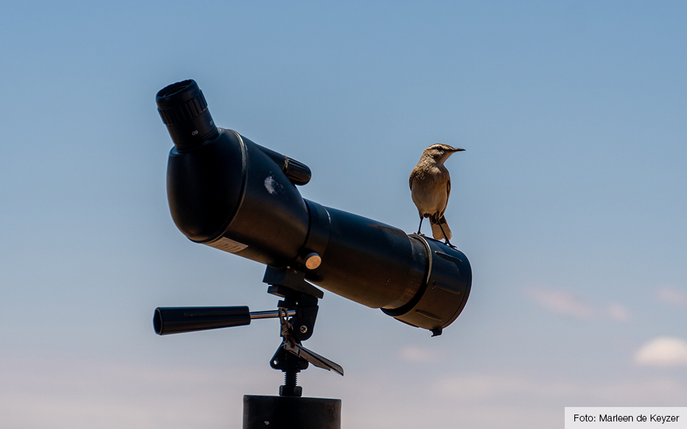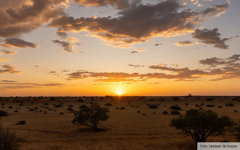 Ooit was dit waarschijnlijk het centrum van waaruit de allereerste mensen zich verspreidden over het Afrikaanse continent. Nu we zelf op de duinen staan, is dat moeilijk voor te stellen. De Kalahari lijkt een ander universum. Schimmen aan de horizon dansen onder een deken van woestijnhitte. Vurige zonsondergangen geven de dorre omgeving een magisch randje. Maar bovenal: zelf zijn we slechts een onzichtbare pixel in een gigantisch gebied, waarin nagenoeg niemand meer leeft.