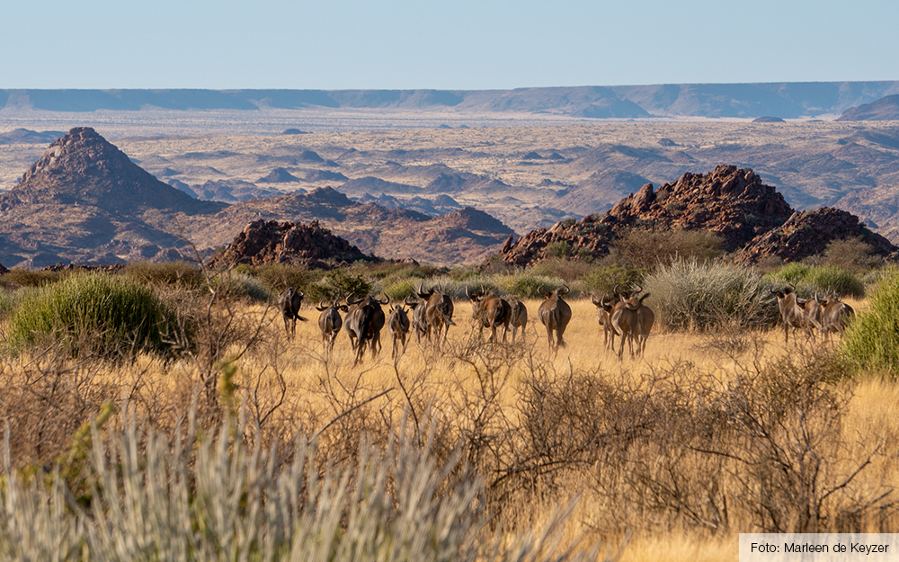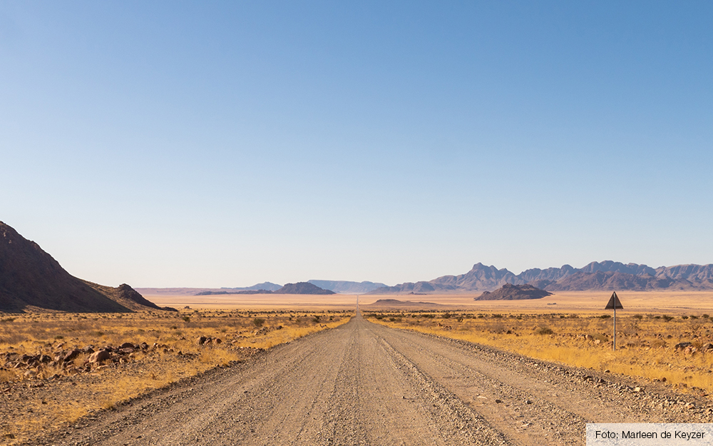 Als we na een korte drie uur rijden nabij Mariental de hoofdweg verlaten, heet het ‘eenzame Namibië’ ons eindelijk welkom. Asfalt verandert in gravel. Groepen mensen op straat maken plaats voor gemsbokken die nieuwsgierig opkijken. Waar moderne gebouwen de horizon braken, popt af en toe een boom op uit eindeloze, goudgele grasvelden.