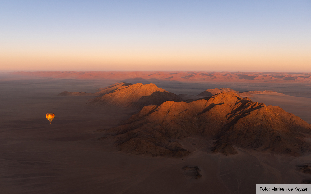 Als we de volgende ochtend in een luchtballon stappen, wordt duidelijk we waar de Namibwoestijn haar naam aan dankt. Eindeloos groot lijkt de ‘uitgestrekte droge vlakte’, haar letterlijke vertaling. Witte zandstroken lijken als wolken om bruine bergpieken te hangen. Oranje zandduinen die sierlijke boven de horizon uitrijzen, vormen het decor. En dan is er nog de opkomende zon die de omgeving elke tien minuten een nieuwe, rode tint geeft. Halleluja!