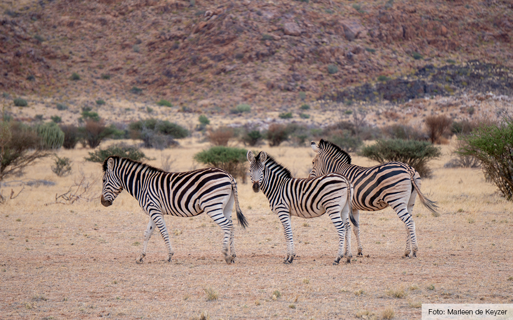 Tijd om bij Onseepkans de grens met Namibië weer over te steken. De bergpartij die de achtergrond van de ‘groene’ Kalahari siert, komt steeds dichterbij. Na een goede acht uur rijden en een zenuwslopend moment bij een bezinestation dat ‘out is gas’ is, parkeren we uiteindelijk met een volle tank aan de rand van een uniek stukje Afrika.