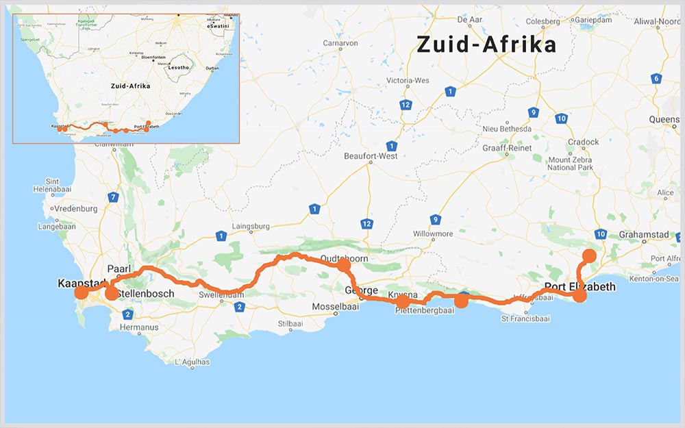Je start in Kaapstad en eindigt in Port Elizabeth. Daar pak je het vliegtuig terug naar de Moederstad.